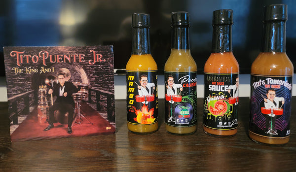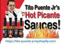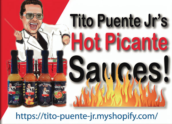 These hot sauces are a great addition to your meals! Four (4) different flavors for your taste buds. "Mambo Diablo" sauce which has the flavor of Mango, Maple Syrup and habanero, Brand New "Puente Pina" Pineapple with a flavor of Fresh Sweet habanero Peppers, "Ran Kan Kan" sauce with Guava fruit and reaper habanero and "Tito's Tamarindo" sauce with the sweetness of the Tamarindo fruit along with Habanero peppers. These sauces are great with any meal and is a great accompaniment with foods from around the world. Taste them and enjoy that "Sabor" and "Salsa" flair that Tito Puente, jr. gives in his music and performances. A custom autographed personalized photo will be provided for anyone just include the name you want on the photo and Tito himself will sign it! Get your Salsa Bundle Pack today!